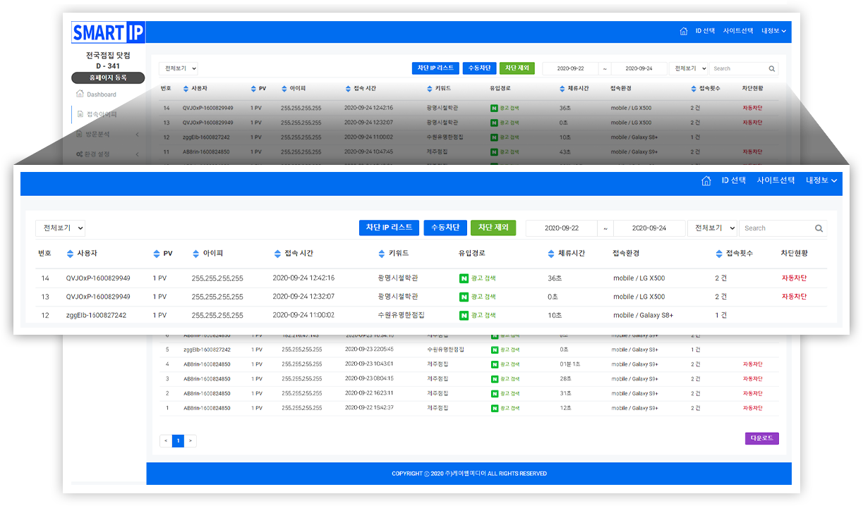 과도한 광고클릭으로 광고비를 소진시키는 부정클릭 IP를 차단합니다.